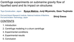 Centrifuge experiments on submarine gravity flow of liquefied sand and its impact on structures