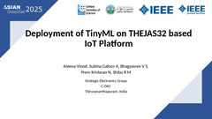 THEJAS32 SoC is based on the VEGA ET1031 processor, a 32-bit single core, in-order, 3-stage pipeline processor developed by C-DAC under the MDP. This work presents the maiden attempt to deploy Tiny Machine Learning (TinyML) on a hardware platform built around the THEJAS32 SoC. A TinyML model was trained and optimized using the TensorFlow framework using Google Colab and deployed to the hardware using the VEGA Software Development Kit (SDK). The model was compressed by as much as 97% compared to the one developed using TensorFlow. This validates the viability of the TinyML-IoT-THEJAS32 platform for TinyML applications.